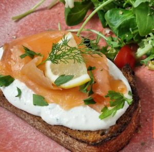 Salade saumon fumé – salade, roquette, saumon fumé, tomate cerises, courgettes grillées, oignon, ricotta 17€